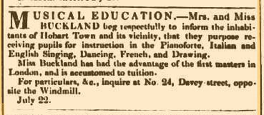 Musical Education – Mrs. and Miss BUCKLAND beg respectfully to inform the inhabitants of Hobart Town and its vicinity, that they purpose receiving pupils for instruction in the Pianoforte, Italian and English Singing, Dancing, French, and Drawing. Miss Buckland has had the advantage of the first masters in London, and is accustomed to tuition …