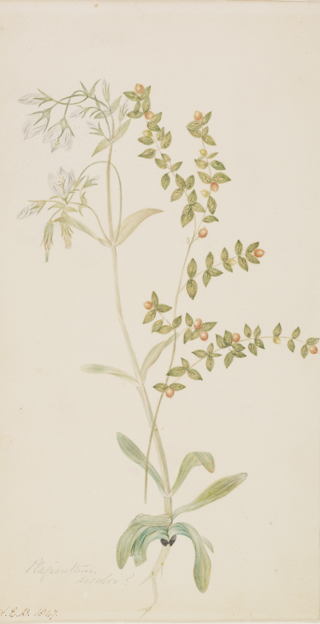 Ann Eliza Buckland arrived in Van Diemen’s Land aboard the Lillias in June 1841, with her children and her husband Charles (1789–1880). Another female natural history illustrator who features in the Society’s art collection, Louisa Anne Meredith also arrived here in 1841.