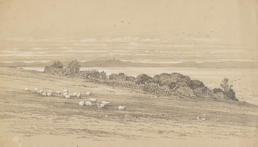 In 1859 Bateman came to Tasmania and stayed with Charles and Louisa Anne Meredith. It must have been at this time that he made the sketch at Maria Island. It was also at this time that he began collaborating with Louisa on her latest book Some of My Bush Friends in Tasmania.