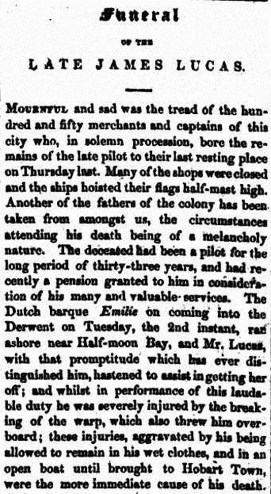 The deceased had been a pilot for the long period of thirty-three years, and had recently a pension granted to him in consideration of his many and valuable services. The Dutch barque Emilie on coming into the Derwent on Tuesday, the 2nd instant, ran ashore near Half-moon Bay, and Mr. Lucas, with that promptitude which has ever distinguished him, hastened to assist in getting her off; and whilst in performance of this laudable duty he was severely injured by the breaking of the Warp, which also threw him over board; these injuries, aggravated by his being allowed to remain in his wet clothes, and in an open boat until brought to Hobart Town, were the more immediate cause of his death.