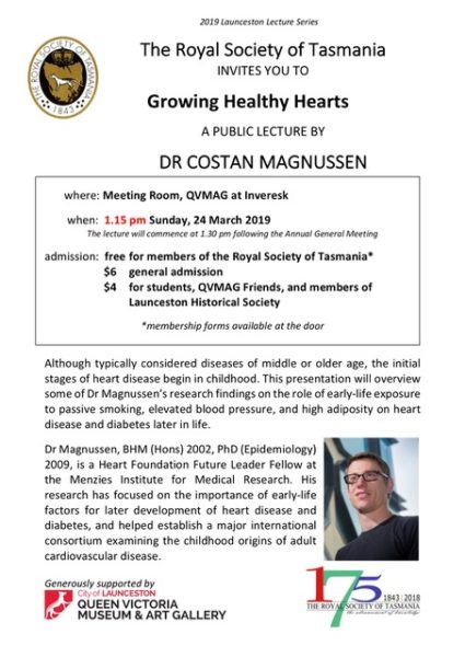 The 2019 Launceston lecture series continues on 24 March at QVMAG. The speaker is Dr Costan Magnussen, a Fellow at the Menzies Institute for Medical Research in Hobart. His topic goes straight to the heart.