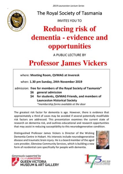 Prof James Vickers – November at QVMAG The Royal Society of Tasmania presents Professor James Vickers – Reducing Risk of Dementia – Sunday, 24th November 2019 at Queen Victoria Museum and Art Gallery at Inveresk, Launceston @ 1.30pm