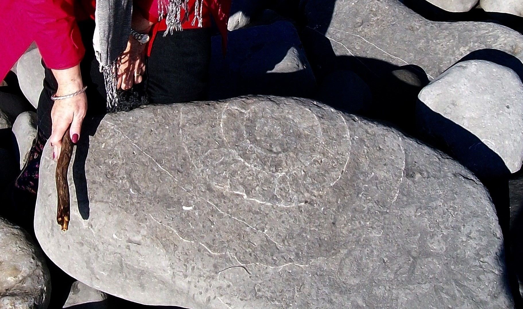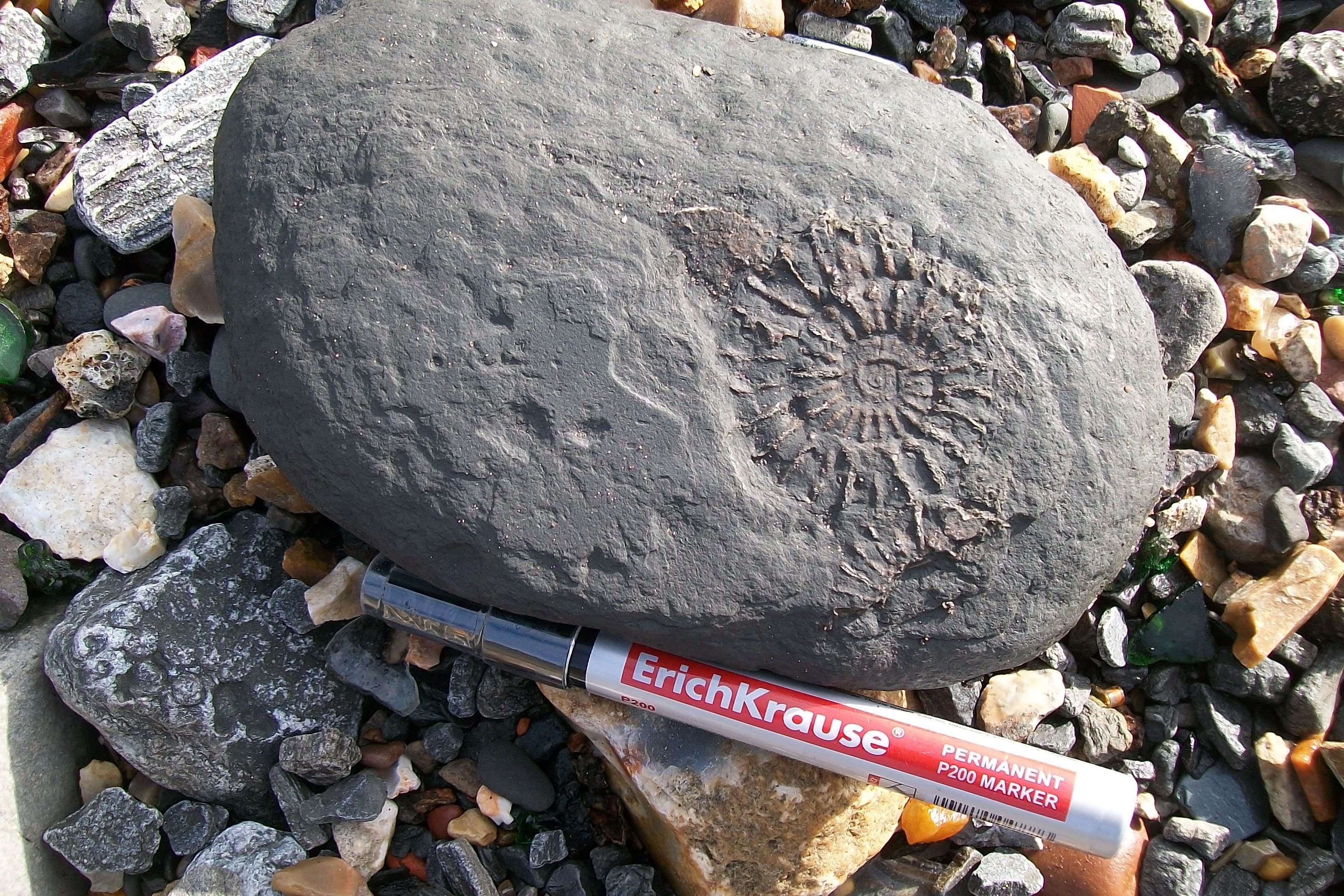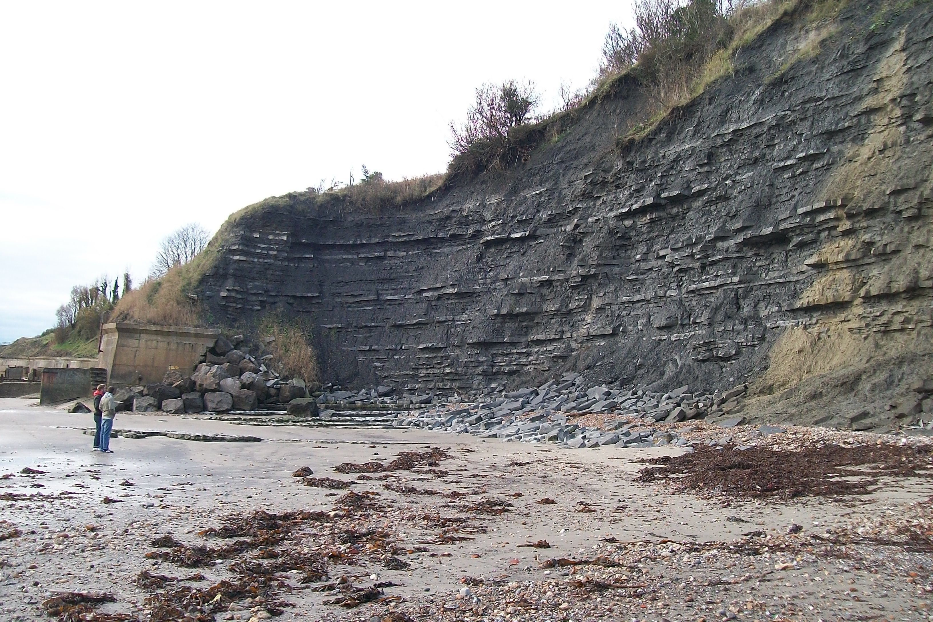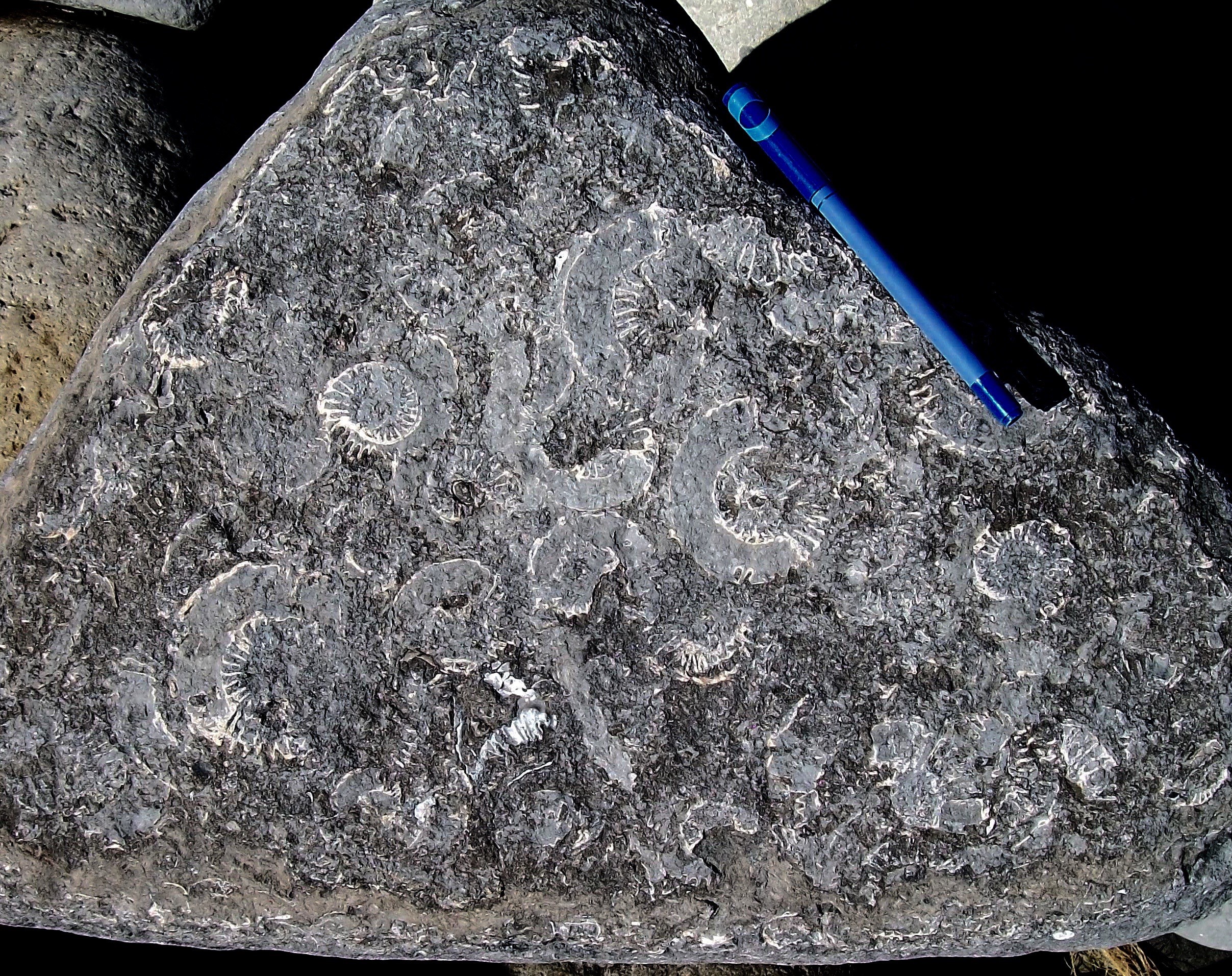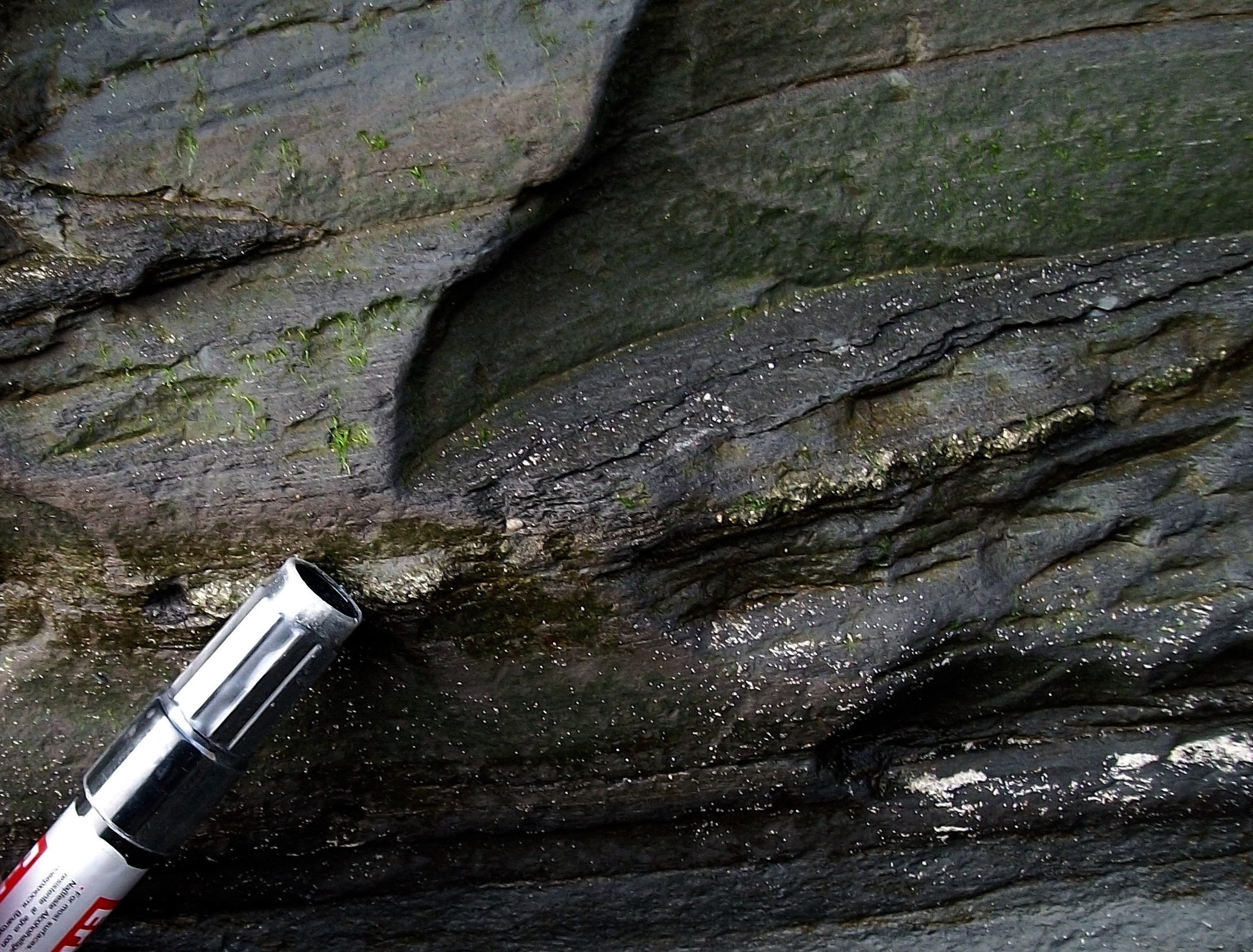 Close-up of black shales showing the mineral pyrite (FeS2) silver-yellow that when analysed with a laser gives the clues to ancient ocean chemistry and mass extinctions.
